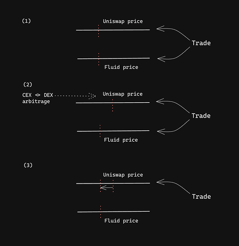 - Initial Trade Routing: When trades occur, they are split between Uniswap and Fluid. Making the final price of both the pools the same.