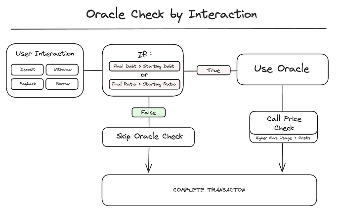 To accomplish this, the protocol checks the final changed values against the starting values, in cases when the final amount is safer we can forgo calling the oracle. The oracle would be used in scenarios where the resulting position would be riskier i.e when borrowing or withdrawing without paying back debt. By reducing the calls to the oracle we will improve transaction costs by at least 20% for half of the current operations utilized by users.