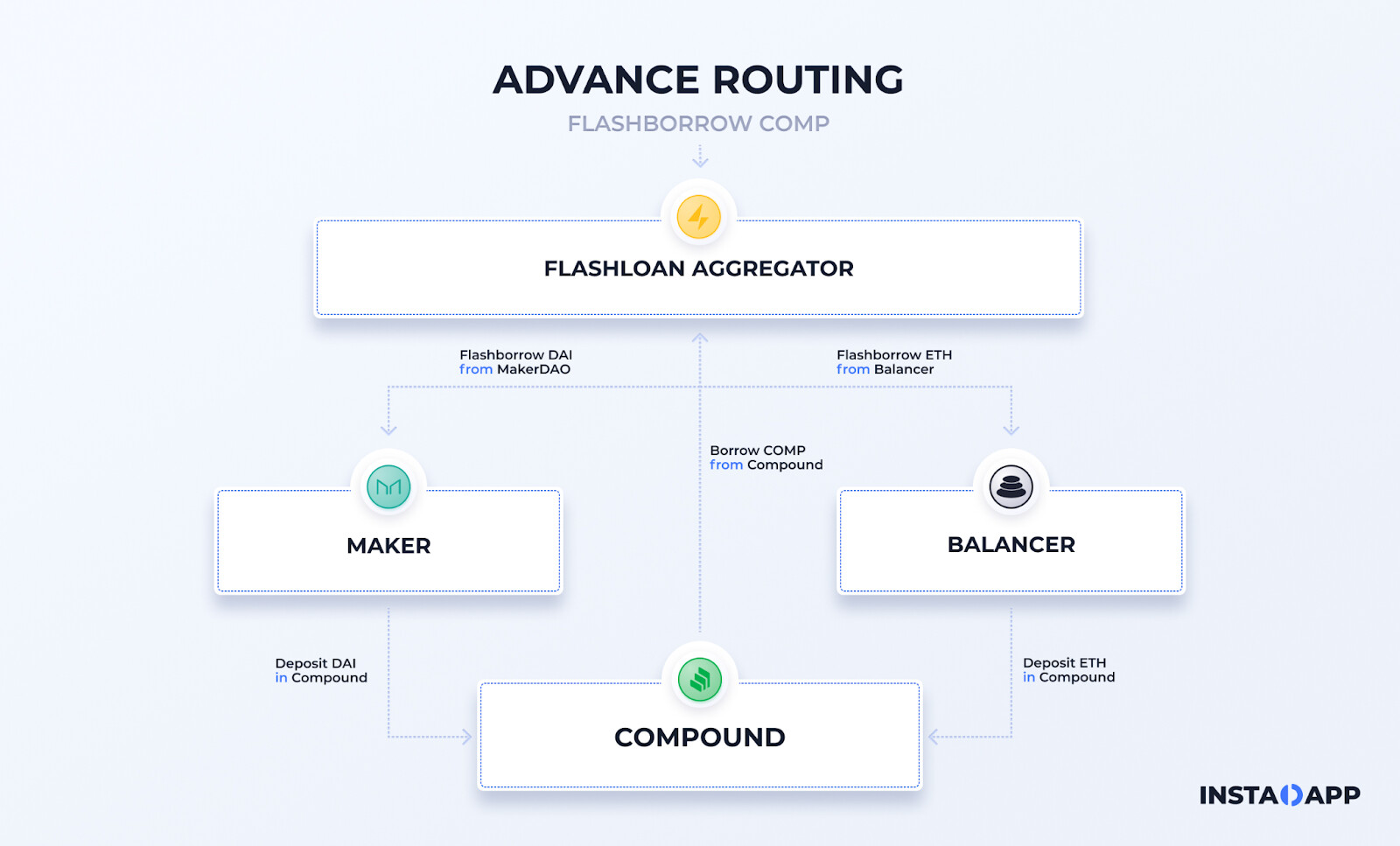 The Instadapp Flashloan Aggregator also features Advanced Routing capabilities. Advanced Routing allows us to expand the capacity and asset availability in the Flashloan Aggregator by utilizing lending protocols to access additional liquidity. This emore competitive routing options and better rates. For example lets say you wanted to migrate a large COMP position however due to the size of the position no single flashloan source has enough COMP for the migration. The Flashloan Aggregator can still accomplish the migration by utilizing Advanced Routing the Flashloan Aggregator will source COMP from Compound’s lending protocol by generating a flashloan deposit on Balancer and Maker.