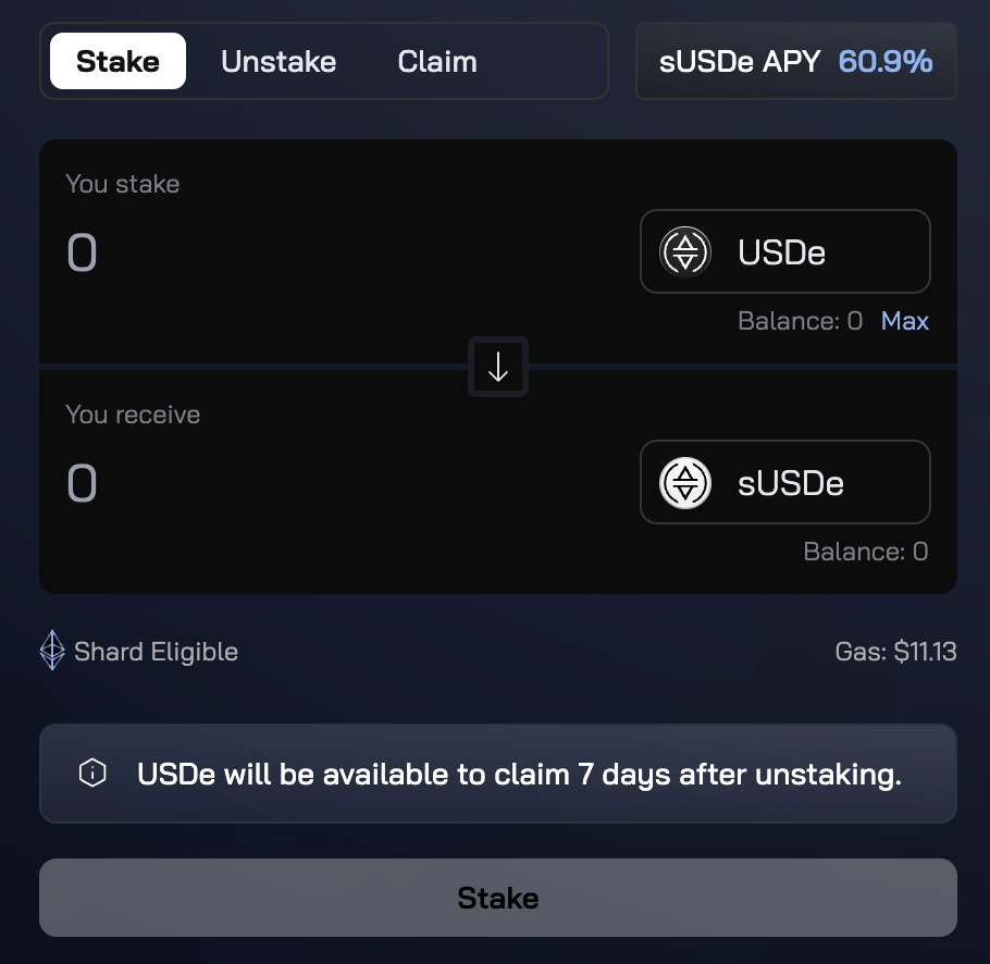 sUSDe is a form of the staked USDe in the revenue share contract. sUSDe unstaking has a 7-day withdrawal delay. USDe can only be minted and redeemed by the whitelisted parties, all other users can only buy/sell USDe from the open market.
