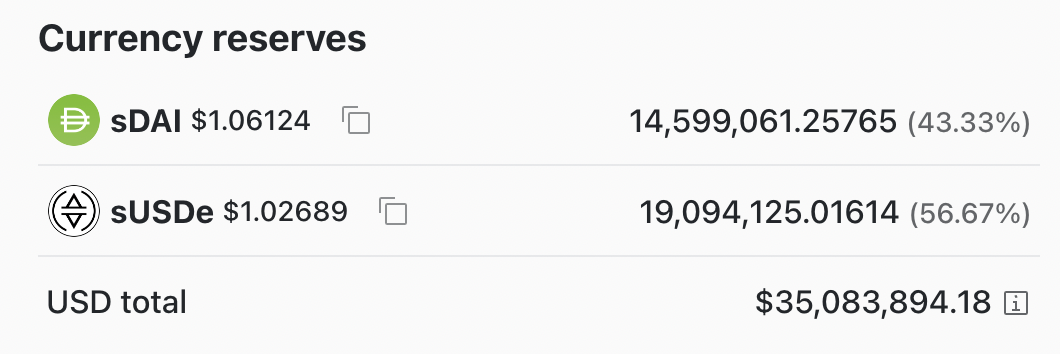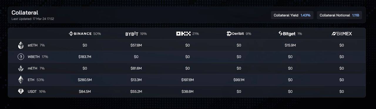 Currently, most of the collateral is in pure ETH which reduces liquidation risks in case of LST depeg. Other collaterals are in the form of the established LSTs such as stETH from Lido, wBETH from Binance, mETH from Mantle, and USDT.