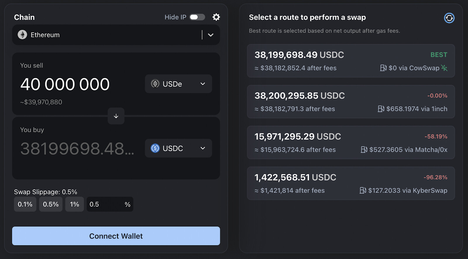 On-chain liquidity for USDe is sufficient to liquidate $40M USDe at once with less than 5% slippage.